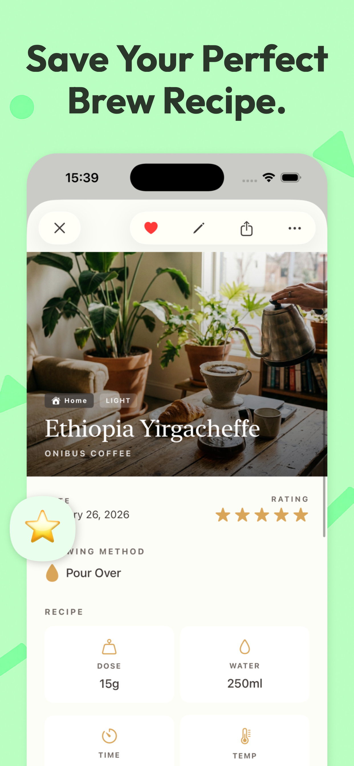 - Brew Recipes – log dose, water, time, temperature