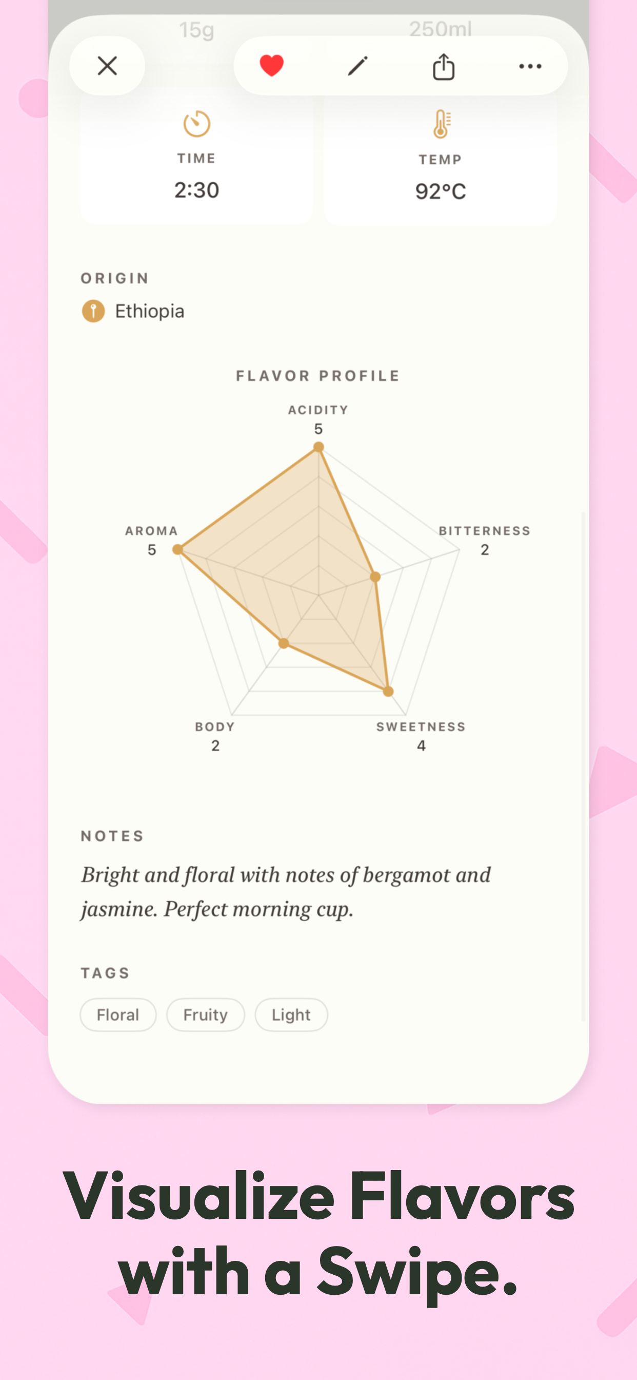 Visualize coffee taste with a 5-axis flavor chart: